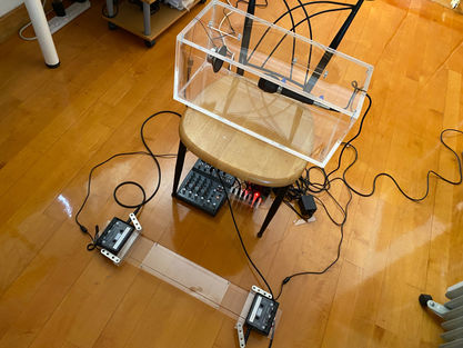 I also attempt to question our existence within this technological heaven. The installation employs primarily low techs, including cassette dictaphones, old microphones and simple amplifiers. The defected qualities and unexpected malfunctions like wobbling of tape loop create sounds that do not much resemble our perceptual reality. Adding to the electro-mechanical delay, harsh resonance within enclosed acrylic surfaces, the sound becomes what seems to be non-ideal perceptual quality in this digital age. Noises, uncertain frequencies and blurry sounds - how can we manage to embrace these things brought by the obsolete or unwanted technologies when the technological advances have already provided us with “perfect” qualities? Our existences are the contribution to technological development, but simultaneously, our existences can also be matters that keep the if we are willing to appreciate the existences of older technologies.